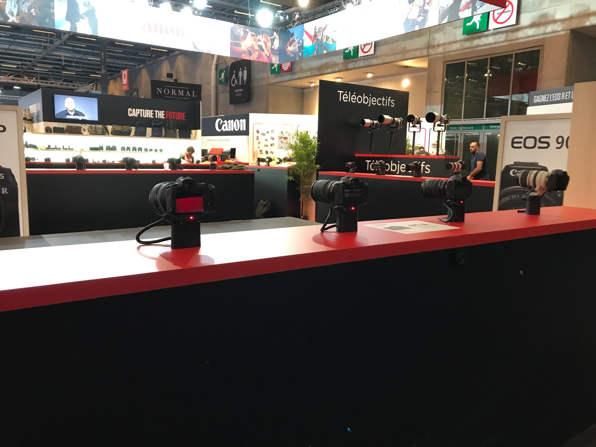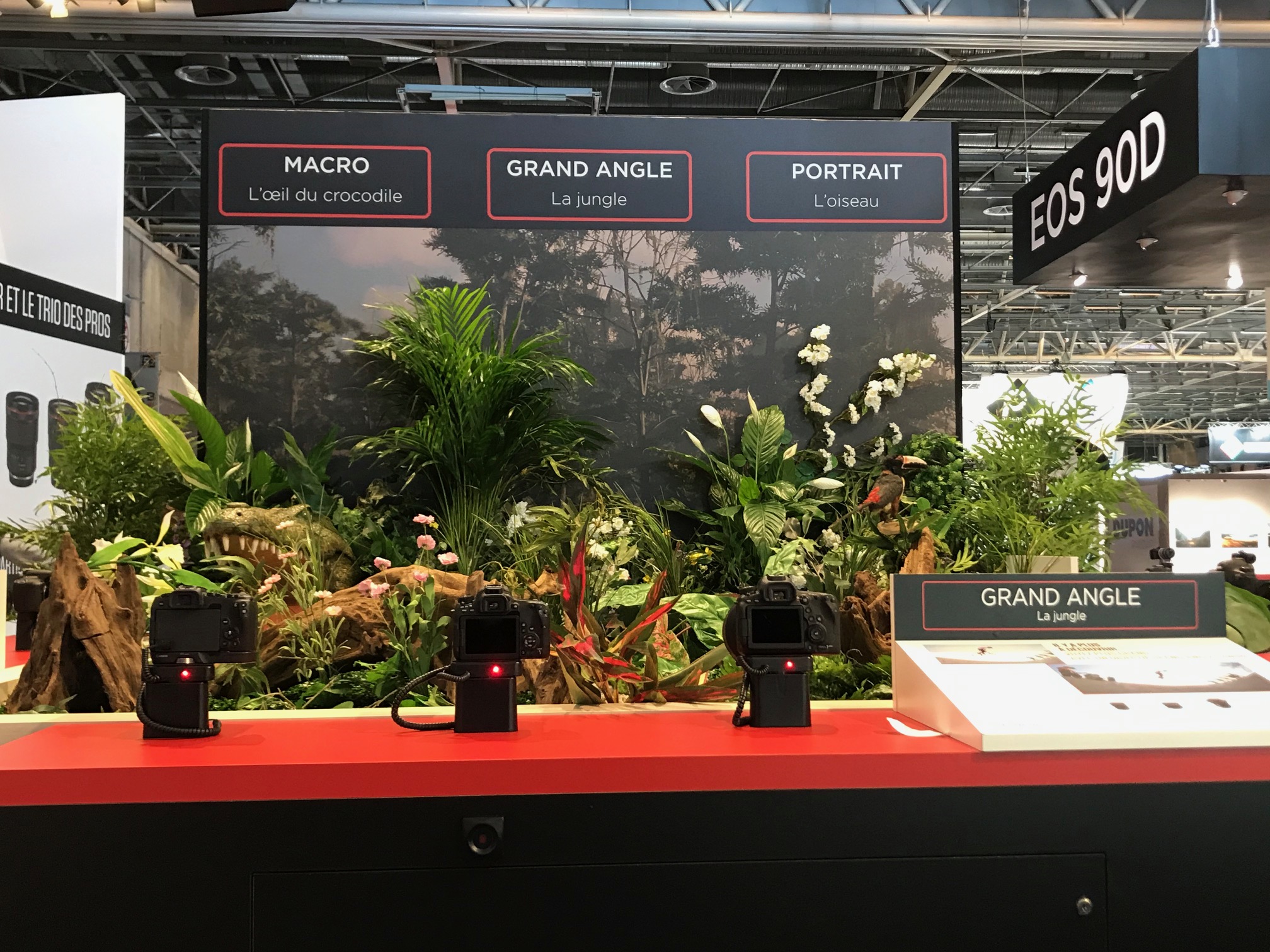 Sur son stand, Canon décide de présenter au public ses dernières productions telles que le reflex EOS 90D ou les hybrides EOSM6 Mark II et EOSM200, ainsi que les compacts G7 X Mark III et G5 X Mark II.